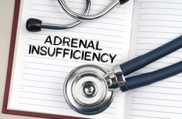 505651760 Medicine concept. On the table is a stethoscope, a pen and a notebook in which it is written - Adrenal Insufficiency