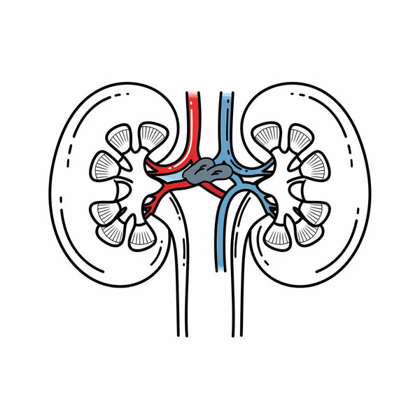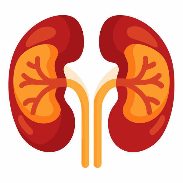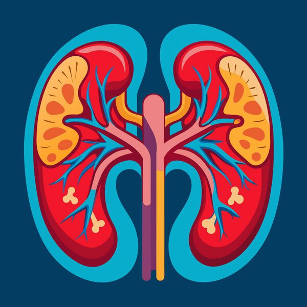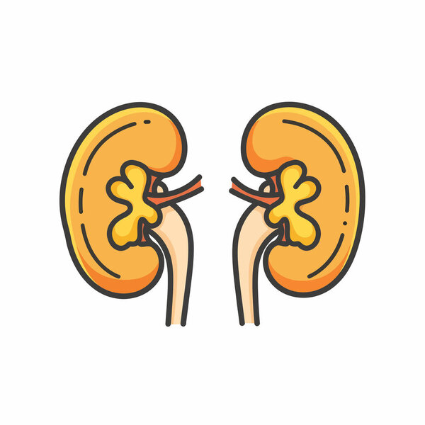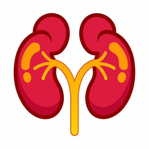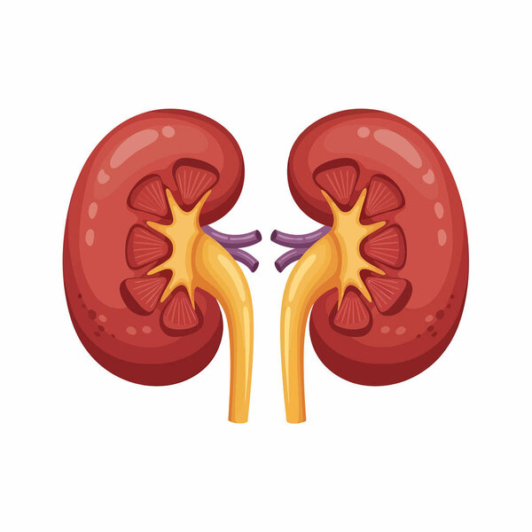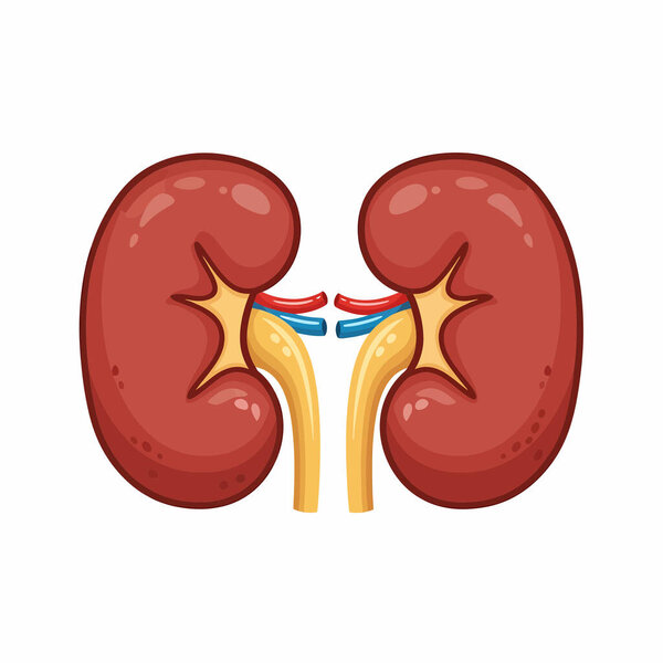 850344788 A colorful cartoon-style illustration featuring two human kidneys, complete with their associated vessels and ureters, set against a clean white background.