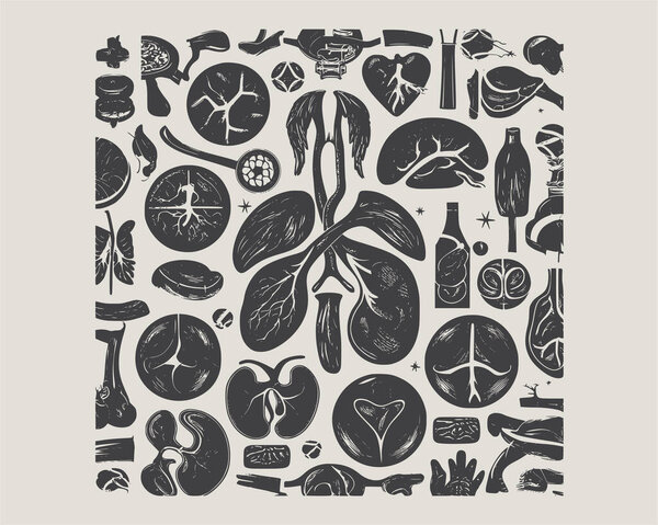 850611466 Creative black and white anatomy pattern featuring human body organs including lungs heart kidney brain and liver detailed hand drawn medical design ideal for education science projects health posters and t shirt prints artistic anatomical background