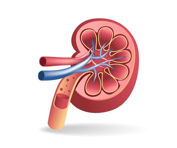 850344778 Detailed illustration of human kidneys, showcasing their structure, blood vessels, and internal anatomy. Ideal for medical education and health-related content.