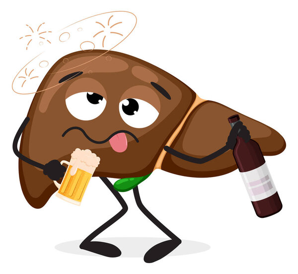 673056890 Vector Illustration of Cartoon unhealthy liver with bottle and glass of alcohol, isolated on white background
