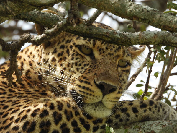 576587946 A closeup shot of a leopard lying on a tree branch in Maasai Mara National Park, Kenya, East Africa