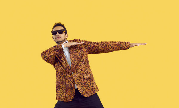 855900526 Funny young black man dancing isolated on a yellow colour background. Confident ethnic guy wearing a leopard jacket and cool sunglasses dancing to hip hop music in the studio