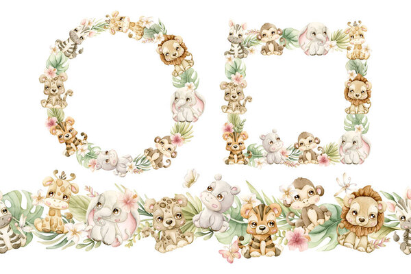 857822352 Cute Animals Plants Wreath Frame Seamless Border Set. Safari Jungle Tropical Exotic Flower leaves Watercolor hand painted summer pastel neutral isolated illustration on white background for kids baby