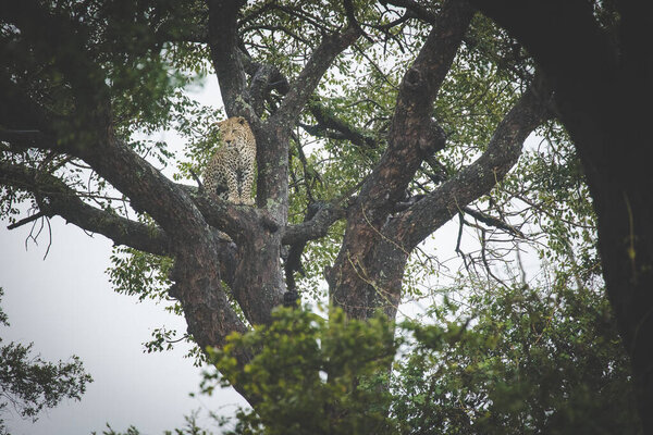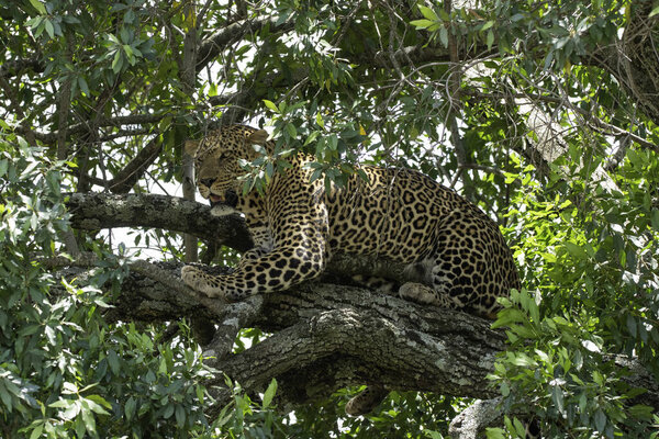 743010476 A male leopard sitting on a tree branch inside Masai Mara National Refuge during a wildlife safari