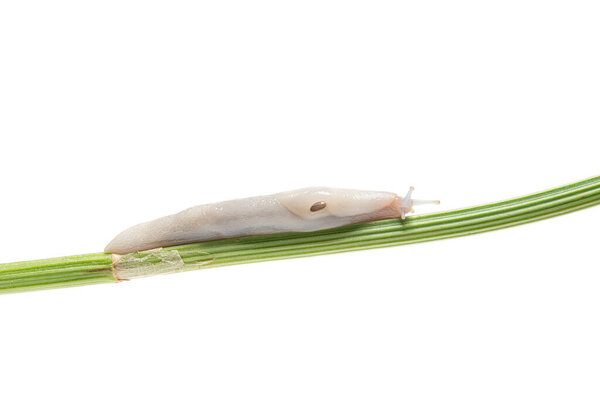 820219800 White albino or candida color variation leopard slug, limax maximus, crawling on a plant stem