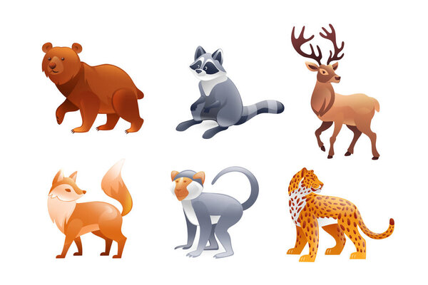 763773928 Set of illustrations animals of America, bear, jaguar, monkey, fox, raccoon, red deer, realistic in 3D style.