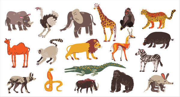 779215084 Collection of African animals set. Elephant, hippo, rhino, lion herbivores and carnivores vector illustration isolated on white