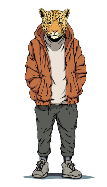 679727792 Portrait of Leopard dressed in a jacket and trousers. Hand-drawn illustration. Vector
