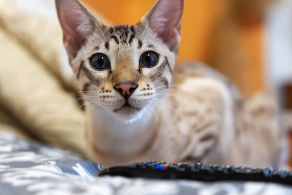 618712834 Domestic cat is lying on the bed. mixture of Bengali, Oriental breeds