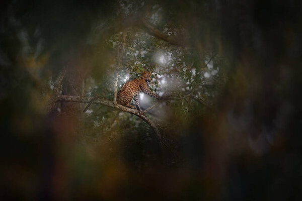 723182838 India wildlife, leopard on the tree in the forest. Indian leopard, Panthera pardus fusca, in the nature habitat, Kabini Nagarhole NP in India. Big cat in Asia. Evening in the nature, rest relaxation.