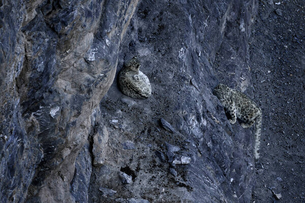 723183044 Pair of snow leopard, cat love in the rock mountain. Snow leporad in the nature mountain habitat with snow, Spiti Valley, Himalayas in India. Two snow leopard Panthera uncia in the rock, wildlife.