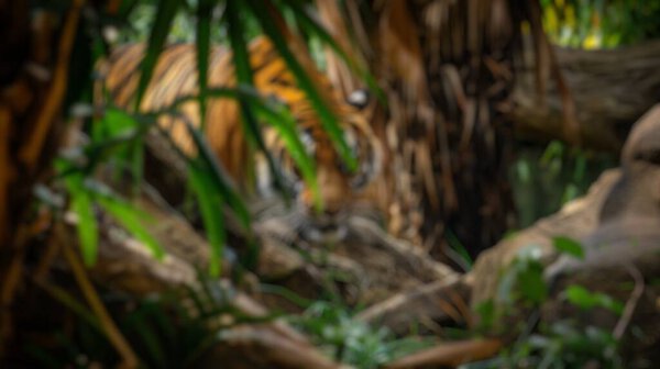 731184982 Blur background of leopard walking and hiding among foliage in the jungle or tropical forest. Wildlife photography with focus on animal camouflage. Nature conservation and jungle animals. Spate.