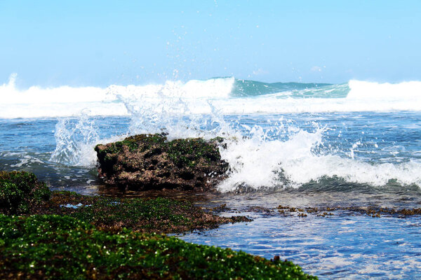 578568268 A rock on the beach covered in moss with ocean waves in the background