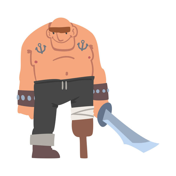 496446644 Brutal Man Pirate or Buccaneer Character with Sabre and Wooden Leg as Marine Robber Vector Illustration. Male Filibuster or Sea Raider Conducting Piracy Concept