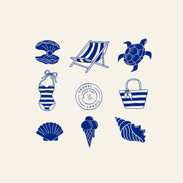 793109918 Hand drawn sea, ocean, seashell, beach, swimsuit, beach chair, watermelon and sunglasses illustrations, patter, minimalist abstract design. Vector art and illustrations