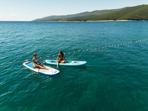 835782372 Two women relax on paddle boards in clear, reflective turquoise water on a sunny day.