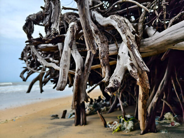 754757990 A tree stump is currently laying on the beach close to the ocean.