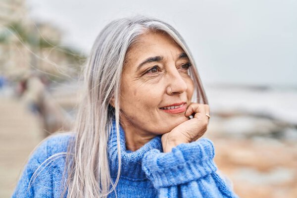 651725232 Middle age grey-haired woman smiling confident looking to the side at seaside