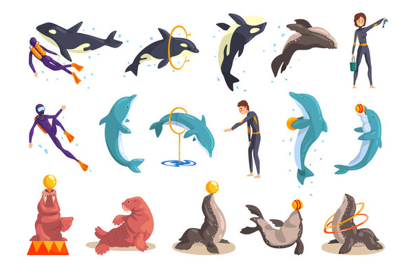782984328 Trainers training and feeding sea animals in dolphinarium or oceanarium. Dolphins showing trick, jumping through hoop in pool cartoon vector Illustration isolated on white