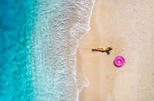 833763908 Aerial view with a woman sunbathing on a pristine white sand beach, surrounded by the turquoise waters of Lefkada, Greece, with a pink inflatable ring nearby, embodying summer bliss. Top view of girl