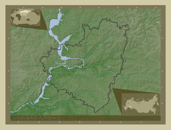637894156 Samara, region of Russia. Elevation map colored in wiki style with lakes and rivers. Corner auxiliary location maps