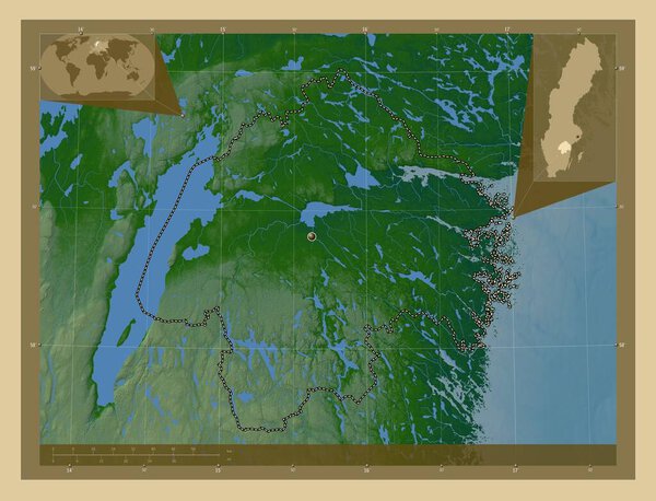642350820 Ostergotland, county of Sweden. Colored elevation map with lakes and rivers. Corner auxiliary location maps