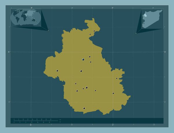 642370386 Idlib, province of Syria. Solid color shape. Locations of major cities of the region. Corner auxiliary location maps