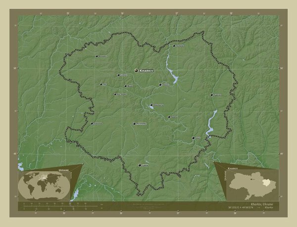 650809776 Kharkiv, region of Ukraine. Elevation map colored in wiki style with lakes and rivers. Locations and names of major cities of the region. Corner auxiliary location maps