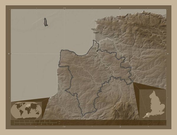 651574854 Torridge, non metropolitan district of England - Great Britain. Elevation map colored in sepia tones with lakes and rivers. Corner auxiliary location maps