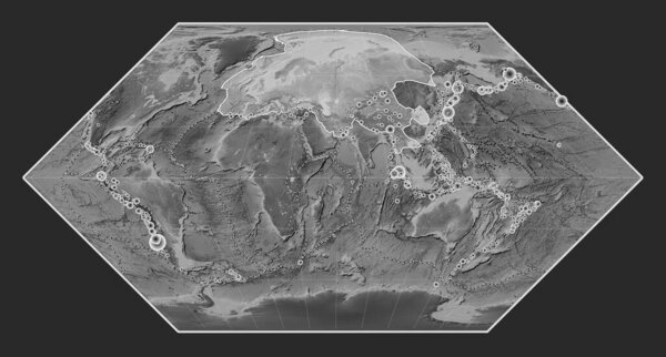 667124498 Eurasian tectonic plate on the grayscale elevation map in the Eckert I projection centered meridionally. Locations of earthquakes above 6.5 magnitude recorded since the early 17th century