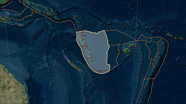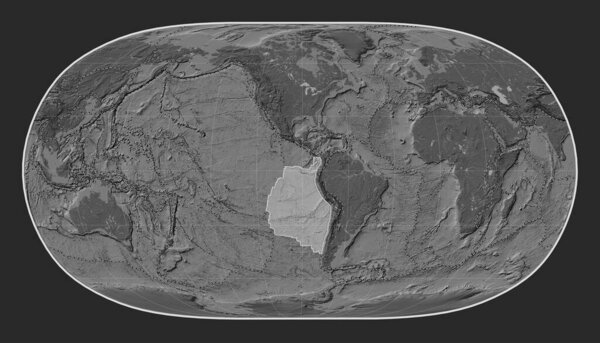 667169250 Nazca tectonic plate on the bilevel elevation map in the Natural Earth II projection centered meridionally. Boundaries of other plates