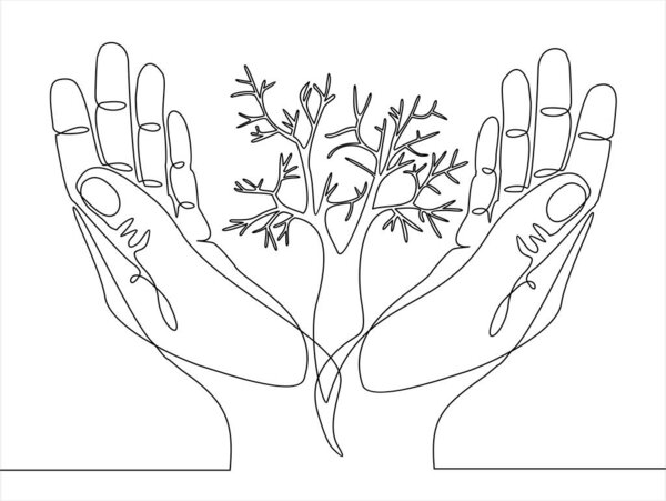 577968492 Hand drawn line art of a human hands with tree vector illustration. Continuous one line drawing