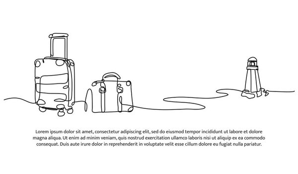 846758516 Continuous line design of go to the beach with a suitcase and see the lighthouse. Single line decorative element drawn on white.