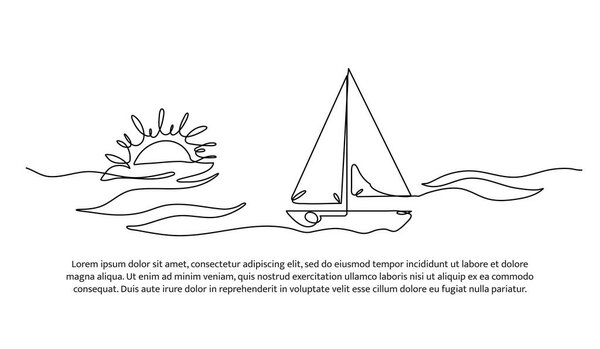 846758522 Continuous line design of sun and boats on the beach. Single line decorative element drawn on white.