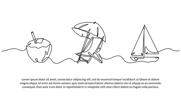 846758570 Continuous line design of boat, chair and coconut on the beach. Single line decorative element drawn on white.