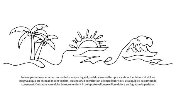 846758590 Continuous line design of palm, sun and beach waves. Single line decorative element drawn on white.