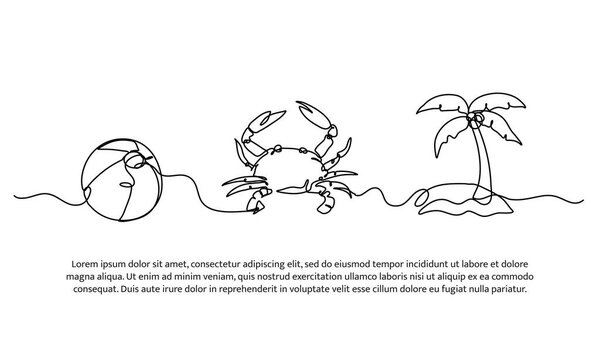846758636 Continuous line design of ball, crab and palm on the beach. Single line decorative element drawn on white.