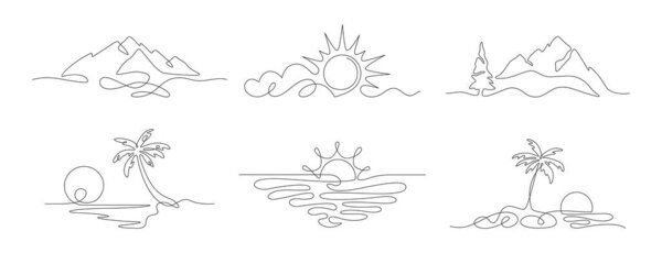 840919750 Vector doodle art continuous one line sun, cloud sky, tropical landscape with mountain, sea beach, coconut palm tree. Linear summer symbol silhouettes. Single outline weather icons, nature elements