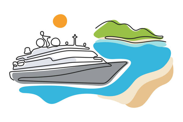 806208114 Luxury yacht and tropical island one line colourful vector illustration