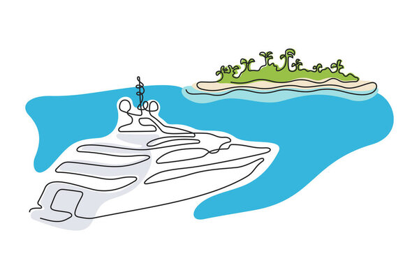 806208156 Luxury yacht and tropical island one line colourful vector illustration
