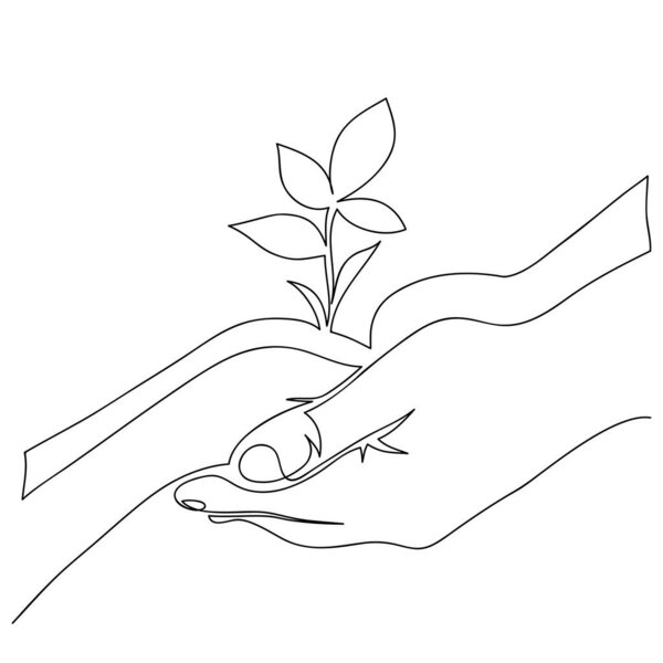 693828362 Hand holds a young sprout that grows in the ground, growing young plant, continuous line drawing, concept vector illustration