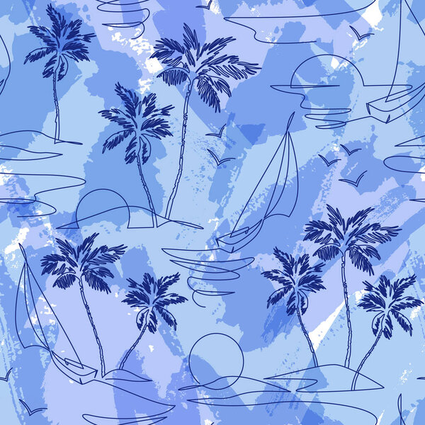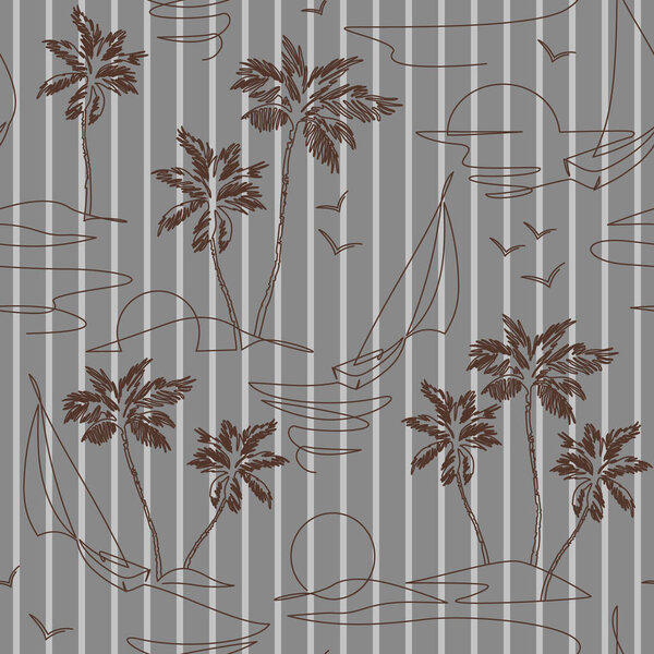 795754002 One line drawing tropical oasis island seamless pattern. Abstract sunset, mountains, coconut palm tree landscape continuous art. Vector illustration for minimal fabric, print, background