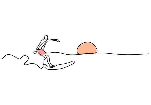 722964892 One continuous line drawing of surfer surfing with sunset beach view isolated on a white background.