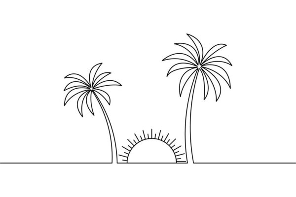 828325686 Minimalist line drawing depicting two palm trees on a tropical island with a simplified beach landscape