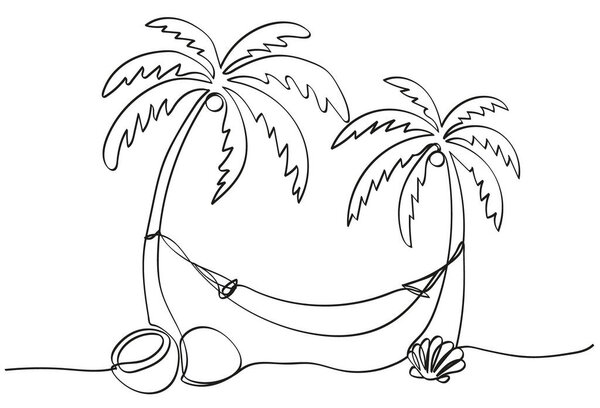 808097676 Minimalist summer one-line vector illustration palm trees with hammock coconuts seashell, simple continuous line drawing of tropical beach scene vacation and relaxation concept