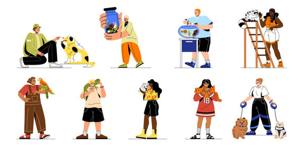 594712006 Set of People and their pets. Young men and women with dog, snail, raccoon, cat, rabbit and parrot. Owners love and care for their animals. Cartoon flat vector collection isolated on white background