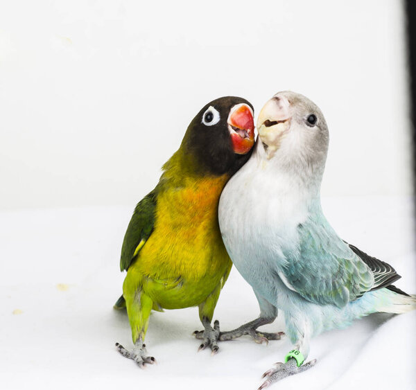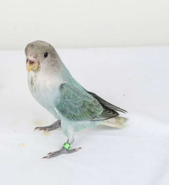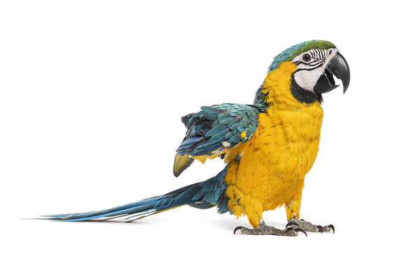 849173816 Young macaw with blue, yellow, and green feathers standing against a white backdrop