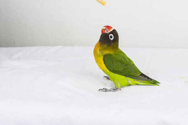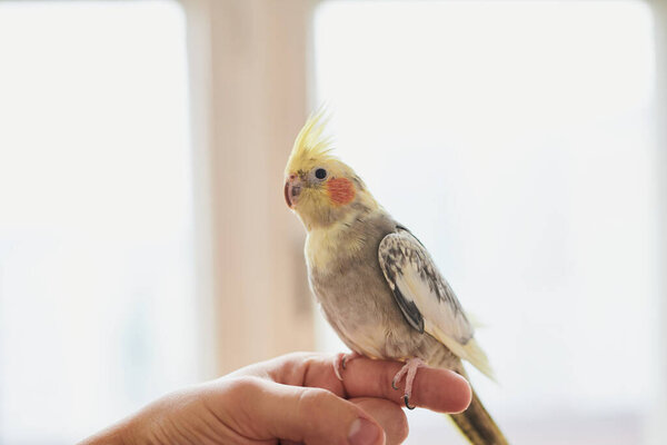 742395008 Portrait of Funny Yellow gray cockatiel parrot sitting at home