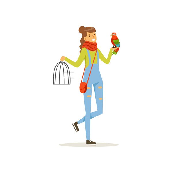176646182 Cheerful girl holding iron cage, macaw parrot sitting on her hand. Full length portrait of young woman with colorful bird. Best friends concept. Domestic animal. Isolated flat design